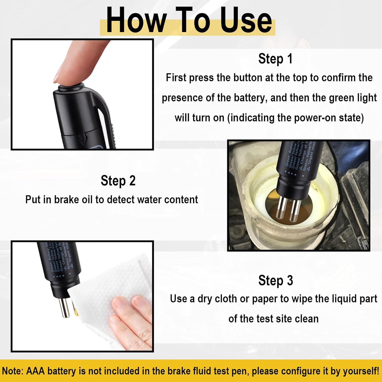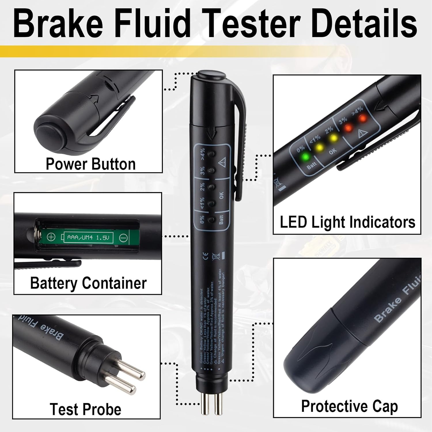 Testues per lengun e frenave i bere nga materiale cilesore me trup plastike te ashper kunder rreshqitjes dhe najlon te forte rezistent ndaj konsumit, i cili garanton perdorim te gjate edhe ne kushte te veshtira. Dizajni i vogel dhe i lehte pa kabllo e ben te pershtatshem per t’u mbajtur kudo, duke funksionuar me vetem nje bateri AAA 1.5V. I pershtatshem per lengje frenash DOT-3, DOT-4, DOT-5.1, praktik per perdorim profesional ose ne shtepi. I pajisur me 5 LED per te treguar sakte perqindjen e ujit ne lengun e frenave, duke ofruar lexim te qarte pasi sonda metalike zhyten plotesisht ne leng. Perdorim i thjeshte me nje buton: shtypni butonin, zhytni sonden dhe merrni rezultatin menjehere.